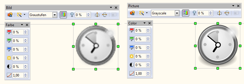 This also works for all combinations of the above modifications. This enhancement is already visible in the Edit Views, but its main goal is to increase Print and PDF export quality (and other exports that can keep Vector Data) when working with Vector Graphic content accordingly. Here is an example from the Edit Views (Left: AOO 4.0.1, Right: AOO 4.1). It's the same SVG graphic modified to Grayscale: